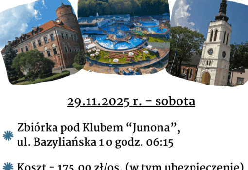 29.11.2025 (sobota) Zbiórka pod Klube „Junona” ul. Bazyliańska 1 o godz. 6:15 Koszt 175 zł/os (w tym ubezpieczenie) Powrót ok. 21:00 Inromacje i zapisy: Ania –...