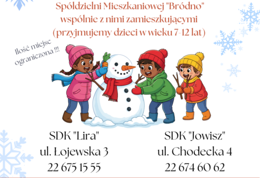 dla dzieci Członków SM „Bródno” wspólnie z nimi zamieszkującymi (przyjmujemy dzieci w wieku 7-12 lat) 19.01-30.01.2026 godz. 8:00-16:00 Regulamin akcji Zima w mieściePobierz KARTA KWALIFIKACYJNA UCZESTNIKA...