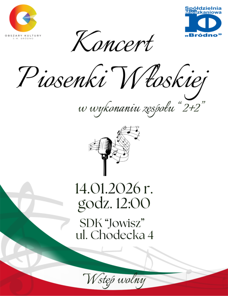 Koncert Piosenki Włoskiej w wykonaniu zespołu „2+2” 14.01.2026 godz. 12:00 SDK „Jowisz” ul. Chodecka 4