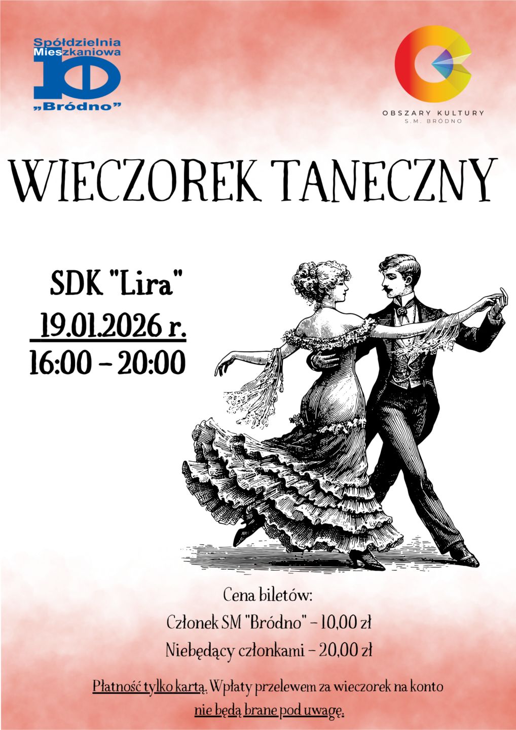 Wieczorek taneczny 19.01.2026 19.01.2026 godz. 16:00-20:00 SDK „Lira” ceny biletów: Członek SM „Bródno” 10 zł; Niebędący członkami 20 zł.