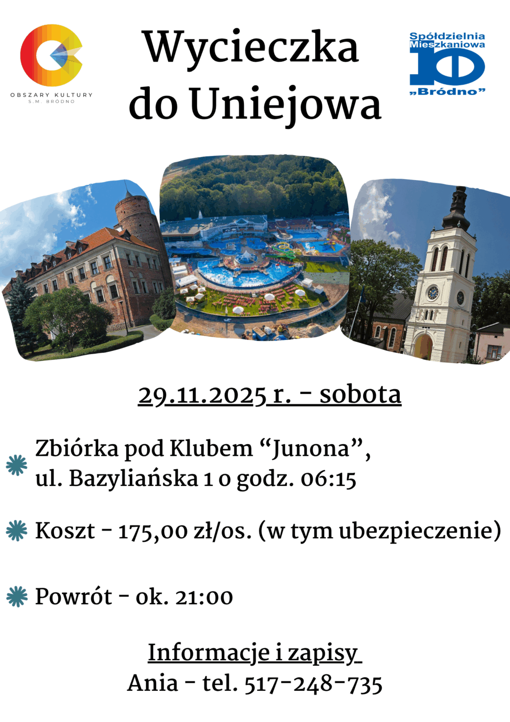 Wycieczka do Uniejowa 29.11.2025 (sobota) Zbiórka pod Klube „Junona” ul. Bazyliańska 1 o godz. 6:15 Koszt 175 zł/os (w tym ubezpieczenie) Powrót ok. 21:00 Inromacje i zapisy: Ania – tel. 517 248 735